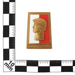 Metal pin with the logo of the Polish United Workers' Party (PZPR). A patriotic gadget from the PRL (Polish People's Republic) era. A rarer version - fastened with a safety pin.