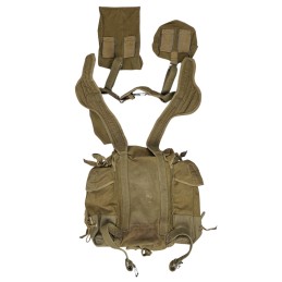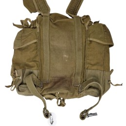 Classic airborne rucksack RD-54 (Rukzak Diesanta), used by VDV units, during the War in Afghanistan (1979-1989). One large chamber, two side pockets. Shoulder straps allow to wear the backpack attached to the back or the butt, to avoid collision with the parachute. Front side of straps have magazine pouches for 2 AK mags and 2 hand grenades. Made of coarse cotton in colour sand-green. Such rucksacks were on the VDV equipment for years 60-th to the end of 90-th years, occasionally to this day. Production from 80-th years. Capacity: 12l.