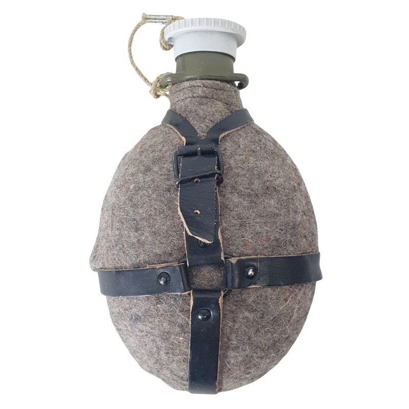 Aluminium canteen of the Czechoslovakian Army (CSLA). With a cover made of thick cloth to keep the temperature of the drink inside longer and with leather straps. Green canteen, grey-brown cover, black leather straps.
