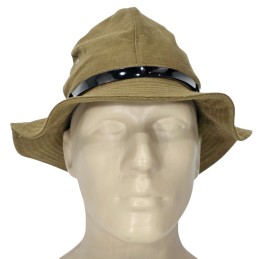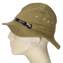 Panama hat made of fabric in olive color. Around the head, above the brim, a strap to facilitate the attachment of additional camouflage. Four ventilation holes. Chin cord. Elastic band at the back for a precise fit of the hat to the head.