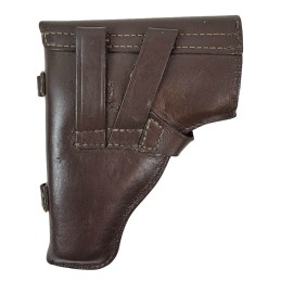Made of "kierza" (artificial leather) universal holster - intended both for TT wz 33 pistol and Nagant 1895 revolver. Belt loops, knop buckle, leather trim. Under the flap a pocket for spare magazine or cartridges for a revolver. Pattern introduced during World War II - exemplars from 1943-1947 production, sewn flat. Early type kierza. Economy cleats -...