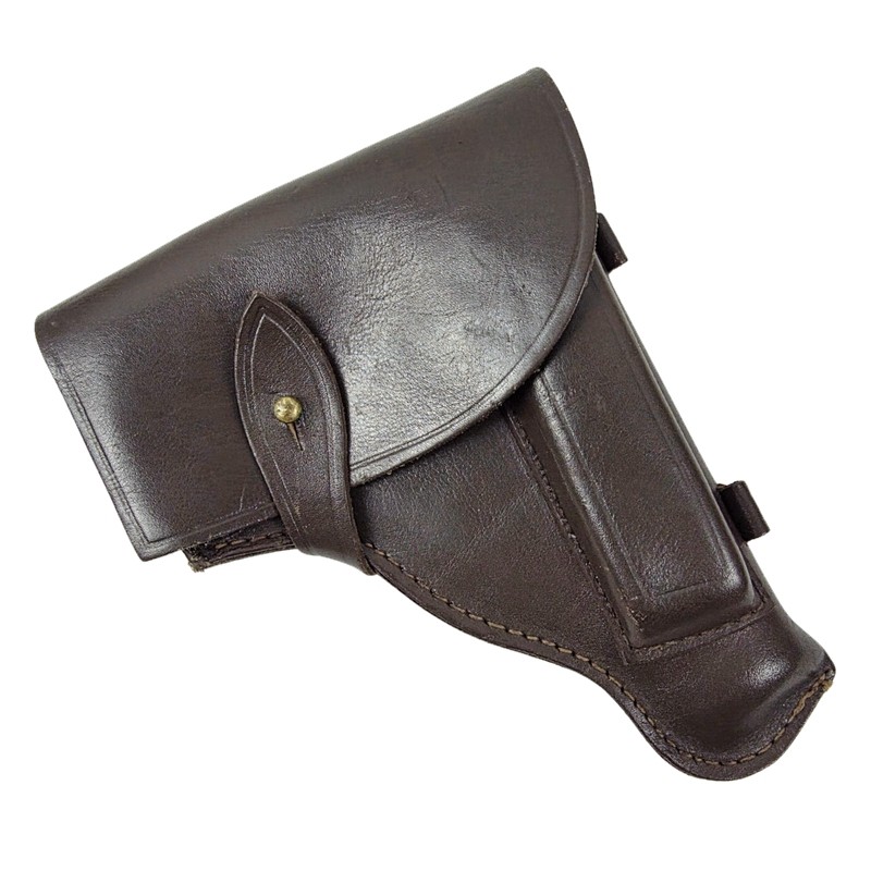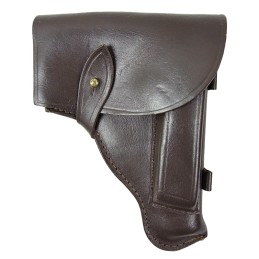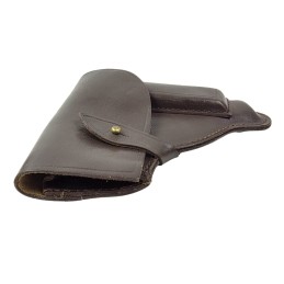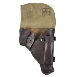 Made of "kierza" (artificial leather) holster for TT 33 pistol. Belt loops, knop buckle, leather trim. Under the flap a pocket for a spare magazine. Modified pattern introduced during World War II. Exemplar from the post-war production.