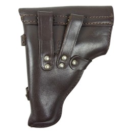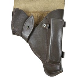 Made of "kierza" (artificial leather) universal holster - intended both for TT wz 33 pistol and Nagant 1895 revolver. Belt loops, knop buckle, leather trim. Under the flap a pocket for spare magazine or cartridges for a revolver. Pattern introduced during World War II - exemplars from 1943-1947 production, sewn flat. Early type kierza. Economy cleats -...