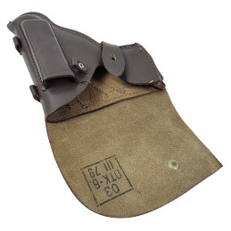 Leather holster for Makarov pistol. Double belt loop, pin fastening. Holster entirely sewn - no rivets used. Manufactured between 1970 and 1979.