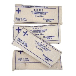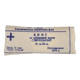 White, cotton bandage. Width of 10 cm, 5 m length. Bandages from supplies of army. Past the sell-by date - only for historical reconstruction. Production from 1970-1979 years.