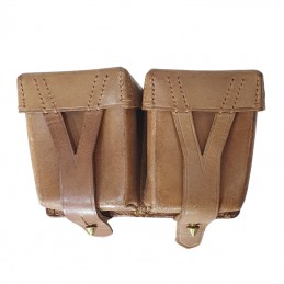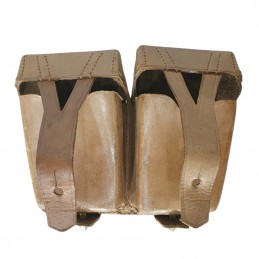 Ładownica na magazynek bębnowy do pistoletu maszynowego PPSz-41. Wersja mocowana do pasa na parciane szlufki, z dodatkowym paskiem na ramię. Zapinana na mosiężny knopik.