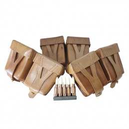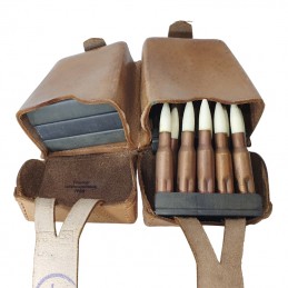 Skórzana ładownica na łódki z nabojami do karabinu Mosin. Kieszonki mieszczą 30 naboi (6 łódek). Wykonana ze skóry, w latach 50-ych w okupowanych Niemczech w ramach reparacji wojennych dla ZSRR - identyczne ładownice były robione w ZSRR przed wybuchem II Wojny Światowej.