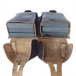 Skórzana ładownica na łódki z nabojami do karabinu Mosin. Kieszonki mieszczą 30 naboi (6 łódek). Wykonana ze skóry, w latach 40-ych w ZSRR. Identyczne ładownice były robione w ZSRR w 1941 roku - jest to najbardziej uproszczona wersja ładownicy M37, z gorszej skóry, bez uchwytów do szelek, przednie zapięcia i boki klapki spinane nitami.Tutaj oferujemy...