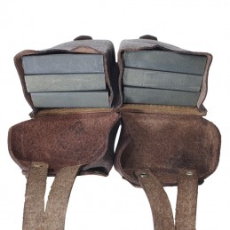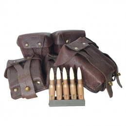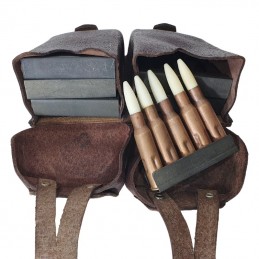 Skórzana ładownica na łódki z nabojami do karabinu Mosin. Kieszonki mieszczą 30 naboi (6 łódek). Wykonana ze skóry, w latach 40-ych w ZSRR. Identyczne ładownice były robione w ZSRR w 1941 roku - jest to najbardziej uproszczona wersja ładownicy M37, z gorszej skóry, bez uchwytów do szelek, przednie zapięcia i boki klapki spinane nitami.