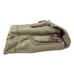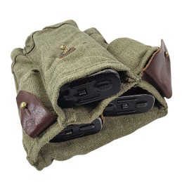 Oryginalna radziecka ładownica na 3 magazynki do Ręcznego Karabinu Maszynowego DP. Wykonana z grubego brezentu. Zapinana na skórzany pasek z metalową sprzączką, z pasem do przenoszenia na ramieniu. Wewnątrz specjalne metalowe uchwyty mocujące magazynki.Egzemplarze z powojennej produkcji, identyczne z tymi z czasów II Wojny Światowej.