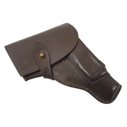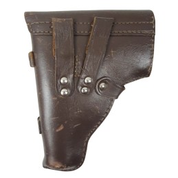 Wykonana z kierzy (sztucznej skóry) kabura do pistoletu TT wz 33. Szlufki do pasa, zapięcie na knopik, skórzane obszycie. Pod klapą kieszonka na zapasowy magazynek. Zmodyfikowany wzór wprowadzony w czasie II Wojny Światowej. Egzemplarz z produkcji powojennej.