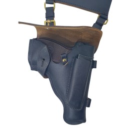 Wykonana z kierzy (sztucznej skóry) kabura uniwersalna - przeznaczona zarówno do pistoletu TT wz 33 jak i rewolweru Nagant 1895. Szlufki do pasa, zapięcie na knopik, skórzane obszycie. Pod klapą kieszonka na zapasowy magazynek lub naboje do rewolweru luzem. Wzór wprowadzony w czasie II Wojny Światowej - egzemplarze z produkcji z lat 1943-1947, szyte na...