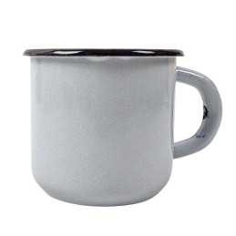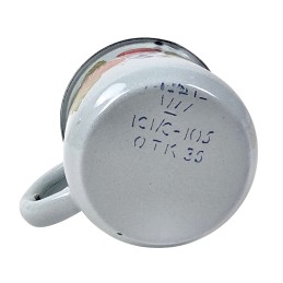 Emaliowany kubek wojskowy. Pojemność 0,37 l. W kolorze jasnobłękitnym z białym wnętrzem. Pasuje idealnie do menażki - nie grzechocze podczas przenoszenia. Wyprodukowano w ZSRR w latach 1960-70.