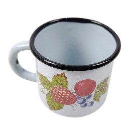Emaliowany kubek. Pojemność 0,2 l. W kolorze niebieskim. Z nadrukiem owoców. Wyprodukowano w ZSRR w latach 1960-70.