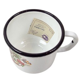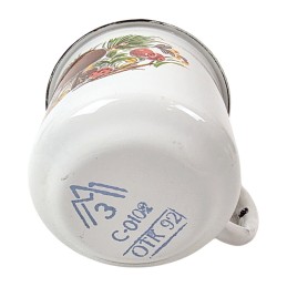 Emaliowany kubek. Pojemność 0,2 l. W kolorze białym. Z nadrukiem darów lasu. Wyprodukowano w ZSRR w latach 1960-70.