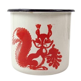 Emaliowany kubek. Pojemność 0,37 l. W kolorze białym. Z nadrukiem nadrukiem wiewiórki z szyszką. Pasuje idealnie do menażki - nie grzechocze podczas przenoszenia. Wyprodukowano w ZSRR w latach 1960-70.