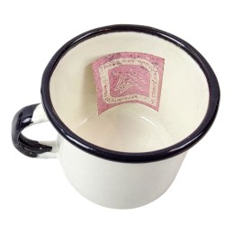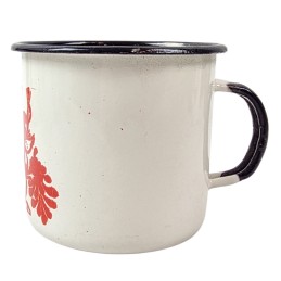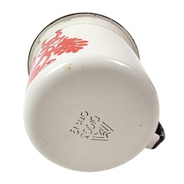 Emaliowany kubek wojskowy. Pojemność 0,37 l. W kolorze białym. Z nadrukiem gałęzi z kwiatami. Pasuje idealnie do menażki - nie grzechocze podczas przenoszenia. Wyprodukowano w ZSRR w latach 1960-70.