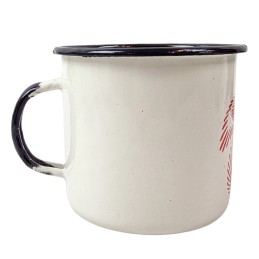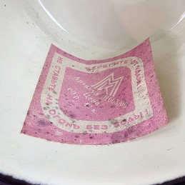 Emaliowany kubek. Pojemność 0,37 l. W kolorze białym. Z nadrukiem wiewiórki z szyszką. Pasuje idealnie do menażki - nie grzechocze podczas przenoszenia. Wyprodukowano w ZSRR w latach 1960-70.
