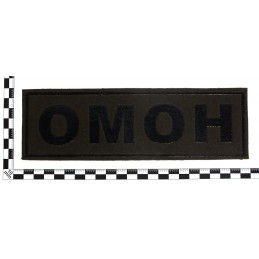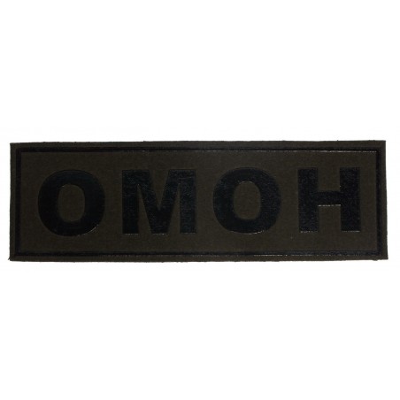 Naszywka na plecy "OMON". Wzór wprowadzony w 2012 i zmodyfikowany w 2014 - gaszona - czarny nadruk na zielonym tle.