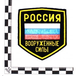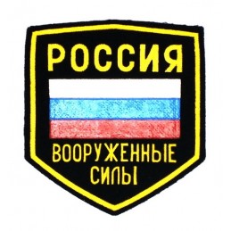Naszywka "Rosja - Siły Zbrojne". Pierwsza wersja naszywki Sił Zbrojnych Rosji, wprowadzona w 1992 roku. Zastąpiona nowym, regulaminowym wzorem w 1994. Powszechnie używana do końca lat 90-ych.