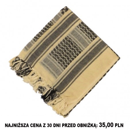 Piaskowo-czarna chusta na głowę - Szemag, popularnie zwana "arafatką". Wykonana z czystej bawełny, ozdobiona frędzlami na obrzeżu.
