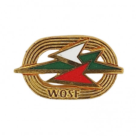 Kolory na odznace wypełnione emalią, na równo z metalowymi ramkami. Plastikowa nakrętka z metalowym gwintem. Produkcja z lat 90-ych.